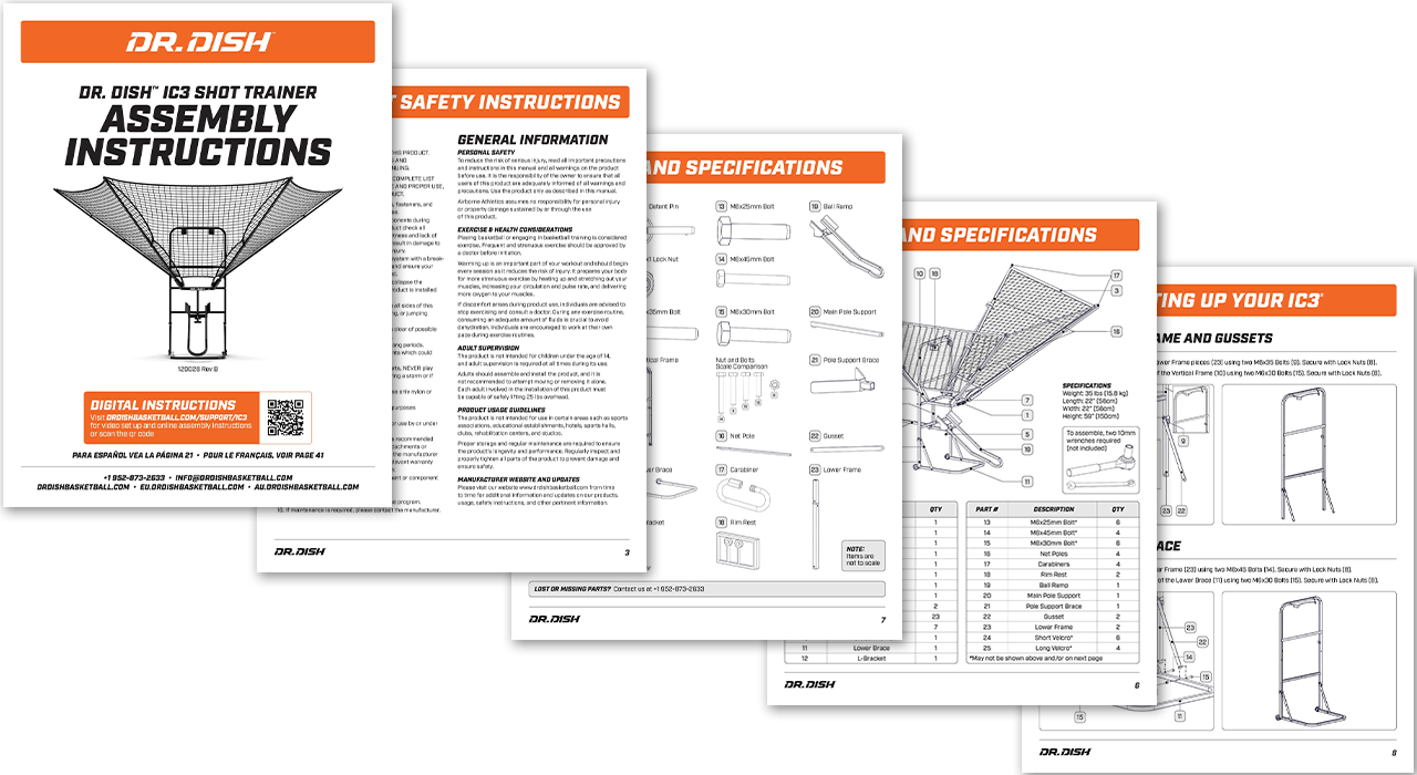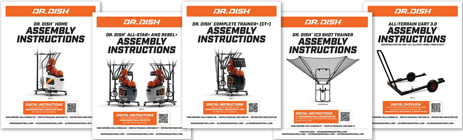 Dr. Dish Basketball needed updated user manuals that reflected current technical information and refreshed branding. These manuals also had to function seamlessly in both print and digital formats, with multiple language versions added for global users.